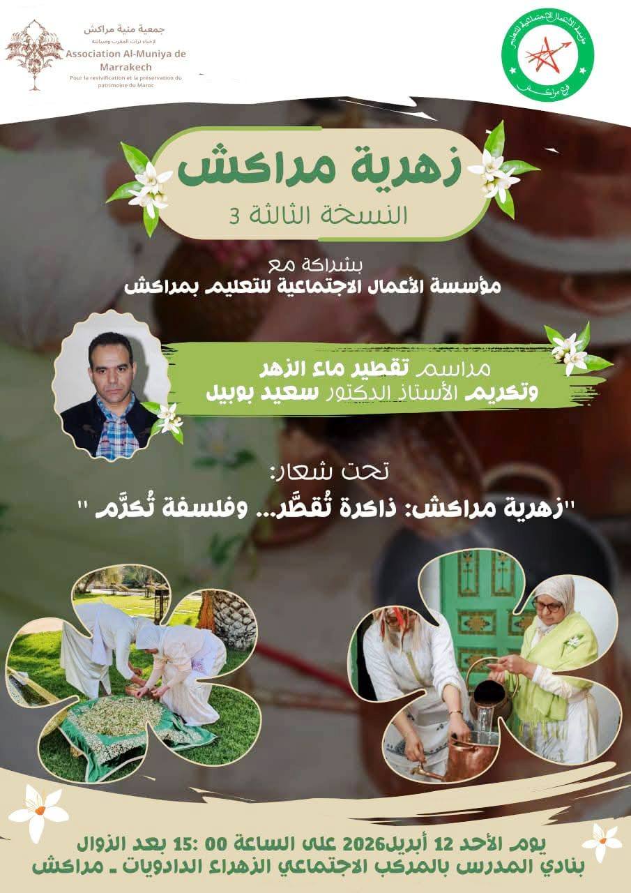 من خلال موسم الزهرية 2026 المنظمة من طرف جمعية منية مراكش لإحياء تراث المغرب وصيانته بشراكة مع وزارة الشباب والثقافة والتواصل، والمجلس الجماعي لمراكش، ومجلس جهة مراكش آسفي، إلى جانب عدد من الأطر والمؤسسات الاقتصادية والتربوية والاجتماعية، من من 22 مارس إلى غاية أمس 12 أبريل ، شهدت كليات ومعاهد وساحات وحدائق ورياضات ومتاحف ومراكز ثقافية ومدارس مدينة مراكش خلال ربيع هذا العام زخماً ثقافياً واجتماعياً مميزاً، تقاطعت خلاله المبادرات التي نظمتها هذه المؤسسات وعرفتها هذه الفضاءات للاحتفاء بتقطير ماء الزهر المستخلص من زهرة الزنبوع “النارنج” وحفظه في الذاكرة الشعبية، والأوساط العالمة ودوائر المثقفين والمبدعين، ودوائر المجتمع المدني، وتكريم المرأة المغربية كقطب حافظ للزهرية على مدى العقود والقرون.
